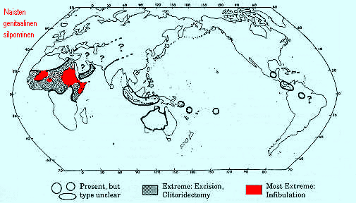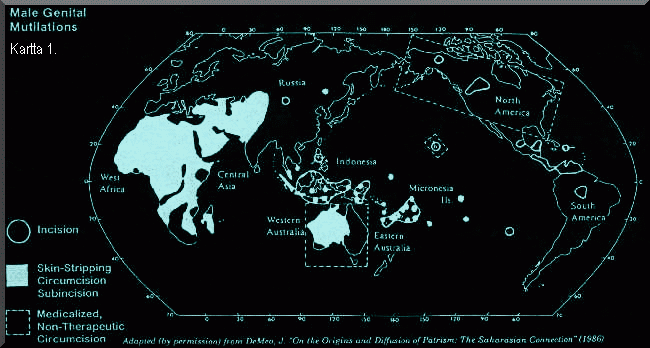 Kartan 1. tiedot ovat suurimmalta osin G.P.Murdockin Ethnographic Atlas -julkaisusta (1967). Murdockin Atlas sisältää myös täsmällistä tietoa siitä, missä iässä typistäminen on tavallisesti tehty. Hänen tarkastelunsa käsittää 350 kulttuuria eri puolilta maailmaa. Tämän tiedoston avulla konstruoimani kartaa osoittaa, että genitaaliset mutilaatiot ovat levinneet hyvin laajalle, keskittyen Koillis-Afrikkaan ja Arabiaan. Etäisyys kyseisestä keskuksesta on merkitsevä siinäkin suhteessa, että mitä kauempana ollaan po. alueelta, sitä vanhempina pojat ympärileikataan (DeMeo 1986, s.159). Toimenpiteen ankaruus ja esiintymistiheys myös lievenevät samalla tavalla etäisyyden suhteen.