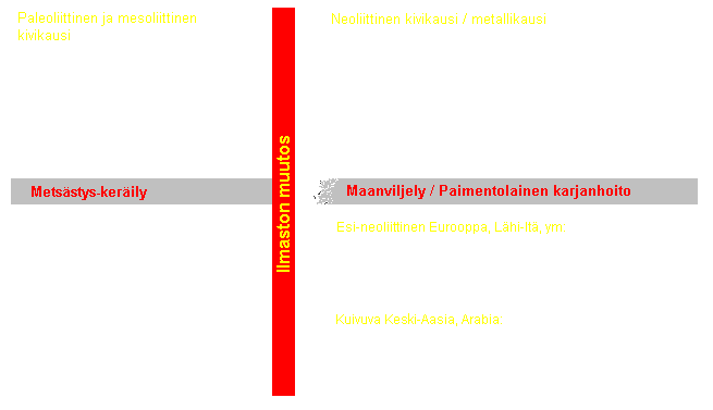 Ilmaston samanaikainen kylmeneminen ja kuivuminen ihmisen asuttamilla alueilla oli vähentänyt käytettävissämme olevia resursseja, ja tämä muutos oli pakottanut ihmisyhteisöt tehostamaan ravinnonhankintaa muokkaamalla ympäristöä, aloittamalla viljelyskasvien kasvattamisen. Ihmiskunta oli siis jo voittanut epäedullisen