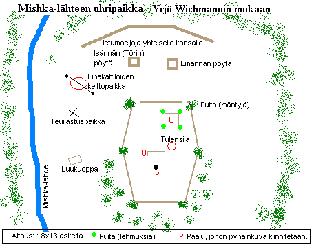 | Monet suomalaiset tutkijat, kuten Yrjö Wichmann, ehtivät käydä tutkimassa sukulaistemme permiläisten uskontoa jo 1800-luvulla, sen ollessa täysissä voimissaan. Uno Harvan legendaarisessa "Permiläisten uskonto" -kirjassa 1914, jota nykyisin valitettavan harvoin siteerataan, selostetaan mm. Wichmannin ja Harvan omien tutkimusmatkojen pohjalta udmurtien, komi-permjakkien ja komien uskonnonharjoitusta. Seuraava kuvaus udmurtien uhripaikoista perustuu Harvan kirjaan. |