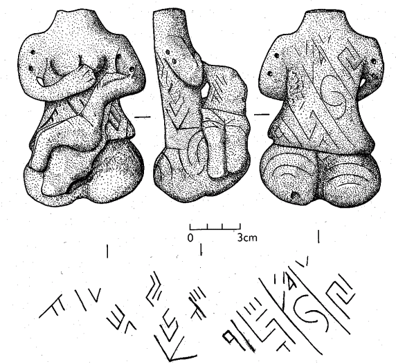 Alempi "lankku-rakenne" täytyy olettaa temppelikummuksi, joka on porrastettu. Varsinaisten temppeleiden lukumäärä, neljä, lienee ymmärrettävä kolmen jumalattaren ja yhden miespuolisen jumalan nimikkorakennuksiksi. "Kolmoisjumalatar" on tuttu hahmo sekä neoliittisen ajan yhteyksissä, että myös myöhemmistä kulttuureista. Seurueen ainoa mies saattaa olla keväinen siittäjä-jumaluus, Attiksen, Balderin ja Lemminkäisen jatkumon paikallinen edustaja. Esineestä voidaan päätellä, että jo niin varhain jumaluus personoitiin useaksi eri henkilöksi, tai ainakin mahdollisen panteistisen jumaluuden eri olomuotoja lähestyttiin erilaisilla rituaaleilla eri tiloissa. |