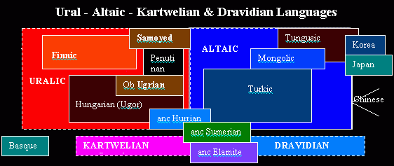 Tässä tavanomaisesta poikkeavassa agglutinoivien eli sanoja taivuttavien kielten hahmotuksessa sumeri, elami ja Vähässä-Aasiassa ja nykyisen Irakin pohjoisessa osassa puhuttu hurri sijottuvat keskelle, ja uralilaiset, altailaiset, kartvelilaiset (toinen kaukasian kieliryhmistä) ja dravida-kielet (Etelä-Intiassa) kohtaavat toisensa tässä keskipisteessä. Suomen ja sumerin välinen mahdollinen yhteys voi liittyä tämäntapaiseen hyvin laajaan kieliperheiden kieliperheeseen, mutta silloin liikutaan ehkä jo niin vanhoissa ajoissa, että tavallisimman käsityksen mukaan ollaan jo kielihistorian "tapahtumahorisontin" takana, josta tieteen tuntemilla keinoilla ei saada enää kyllin luotettavaa käsitystä. Sitä aluetta, jota lännessä rajoittaa Kaspianmeri, etelässä Zagros-vuoret ja idässä Hindukus- ja Tiensan-vuoristot, ja jota jääkauden aikana ja loputtua rajoitti pohjoisessa ensin jää ja asumakelvoton kylmyysaavikko ja sen jälkeen "Hanti-järvi", Länsi-Siperian alangon jääjärvi, ei vielä tunneta arkeologisesti kyllin hyvin. Edellämainitut luonnonolot rajaavat sen seudun, josta käsin on voitu idän suunnasta ehkä vaikuttaa Fennoskandian ja Venäjän alueen asutuksen syntyyn, kovin etelään: Kazahstaniin tai vieläkin etelämmäksi. Jos siirrämme kartalle yllä olevan kaavion, sen keskiö sijoittuu luontevasti juuri edellä mainittuu seutuun, ja "suur-kieliperheen" neljä päähaaraa juuri sinne, missä niitä nykyisin puhutaan, -poikkeuksena Amerikassa puhuttu penutinan. Vanhimmat arkeologiset jäljet sumerilaisista ovat Mesopotamian ulkopuolelta, Zagros-vuorilta ja niidenkin pohjoispuolelta. Baktriasta on jonkin aikaa sitten kaivettu esiin pronssikulttuuri, jolla on monia sumerilaisiin viittaavia piirteitä. Kun sumerilaiset vallitsevan käsityksen mukaan tulivat jokilaaksoihin pohjoisesta, baktrialaiseen yhteyteen lienee uskottava. Meidän ja sumerien väliin jää kuitenkin vielä kaistale aroa, joten ihan naapurinpoikia ei oltu. Suomen ja Fennoskandian pioneeriasutus on esinetyyppien ja todennäköisten asutuksen leviämisteiden perusteella yhdistettävissä läntisestä Euroopasta Ukrainaan ulottuneeseen väestöön, jonka seurannaisina voidaan pitää niitäkin asutuksia, joista tulivat myöhemmät muuttoaallot Suomeen. Sellaista esihistorian "arvoitusta" ei varsinaisesti ole olemassa, jonka ratkaisemiseksi tarvittaisiin joku tuntematon tekijä. Suomalaisten ja sumerien yhteydeksi näyttää jäävän se, että esi-esivanhempamme lienevät olleet yhtäaikaa samassa paikassa, mutta siellä olivat silloin melkein kaikki muutkin, -paitsi eräät kömpelöillä prepositioilla sanottavaansa ilmaisevat barbaarit.