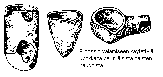 "Pronssi- ja hopeakoristeiden valmistus on ollut naisten puuhaa. Siitä todisteina ovat lukuisat naisten haudoista löydetyt pronssivaluun liittyvät valinkauhat ja upokkaat, joita on tavattu Komista Vepsään. Erittäin innokkaita ovat olleet mordvattaret päätellen siitä, että peräti 70:n naisen haudasta on löydetty valinkauhoja. Varhaisimmat valumestareiden haudat, yhteensä 16, ovat 5.-8. vuosisadoilta. Niistä tavatut sulatus- ja työstämisvälineet eivät jätä sijaa epäilyille.