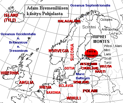 "Sillä aikaa saavutti Jumalan kosto svealaiset, jotka olivat karkoittaneet piispansa. Ja ensin kuninkaan poika nimeltä Anund, jonka isä oli lähettänyt laajentamaan valtakuntaansa, sen jälkeen kun oli tullut naisten maahan, joiden me arvelemme olevan amazoneja, sai samoin kun sotajoukko surmansa myrkystä, jota nämä olivat sekoittaneet lähdeveteen." (Adam von Bremen: Hamburgische Kirchengesichte III 16, 1075 jKr.) "Sen jälkeen tulevat svealaiset, jotka hallitsivat laajoja maa-alueita aina Naisten maahan asti. Itään näistä sanotaan asuvan vepsäläisten, merjalaisten, jäämien, tsuudien ja turkulaisten aina Venäjälle asti." (Adam von Bremen: Hamburgische Kirchengesichte IV 14, 1075 jKr.)